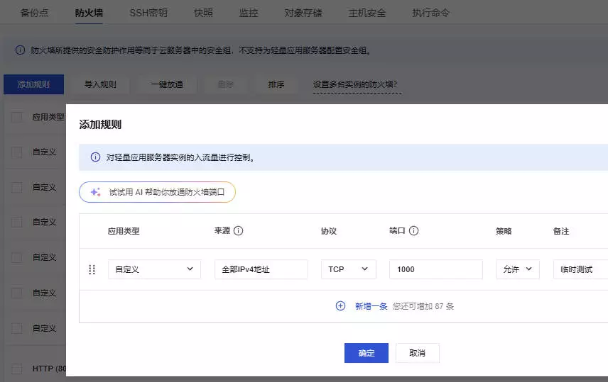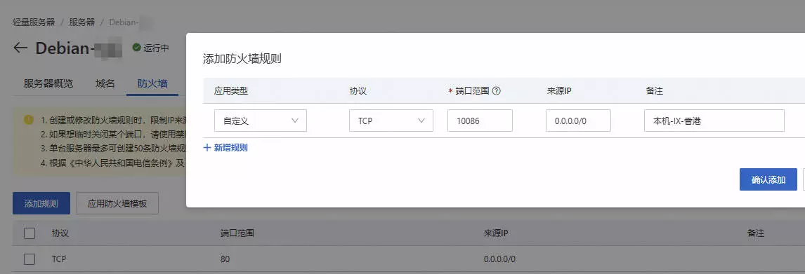 下图为腾讯云轻量服务器防火墙放行端口的示例: