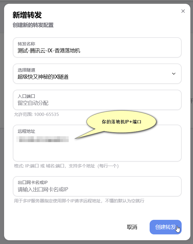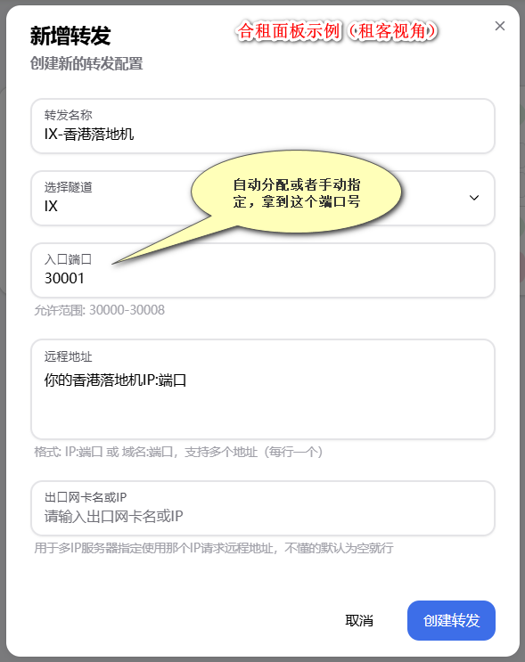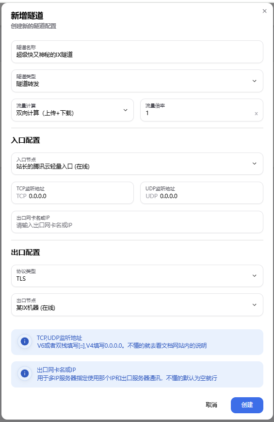 - 隧道名称:起一个清晰易懂的名字,比如 “租客共享隧道” 或 “IX公共接入点”。这将是租客在创建转发时唯一能看到的选项。