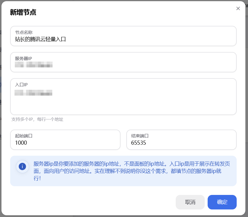 - 端口范围:根据你的规划填写,例如 1000-65535。入口前置机一般是个人独享的机器,所以这台VPS的端口范围一般也是全量的,但一般建议把1024以下的端口预留给操作系统。