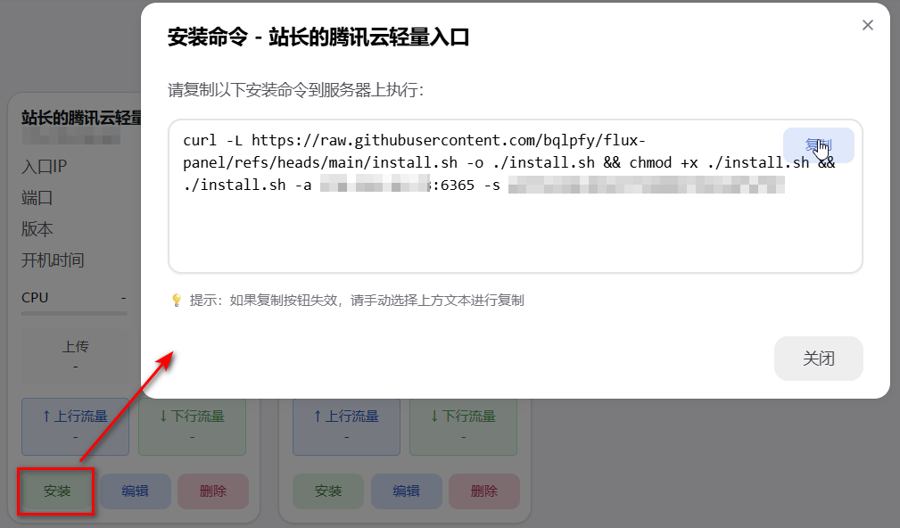 - 在 节点监控 页面,找到你刚刚创建的节点,分别点击操作栏中的“安装”按钮,复制安装命令待用。