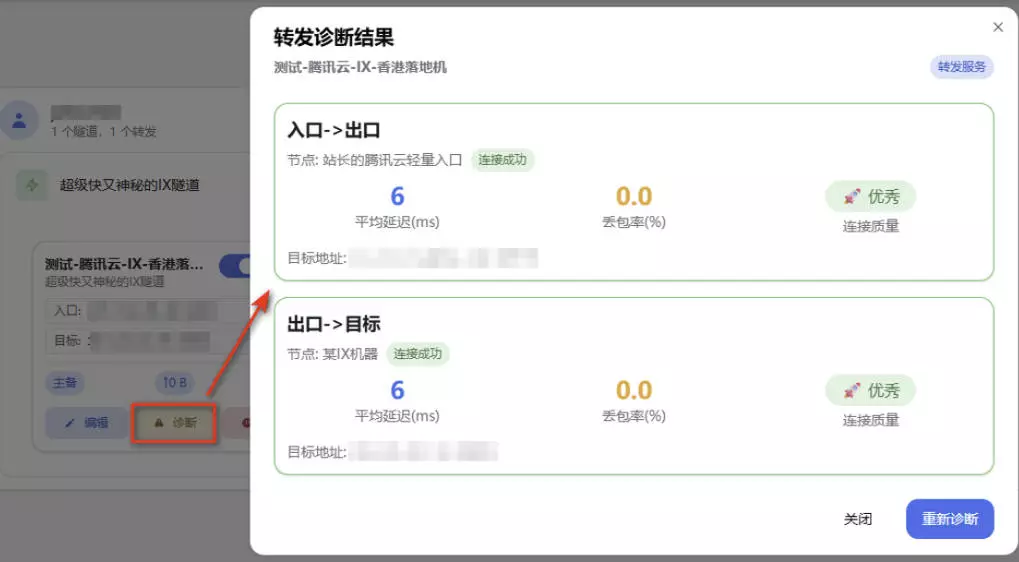 - 点击保存,隧道即创建成功。你可以点击“诊断”来测试隧道的连通性