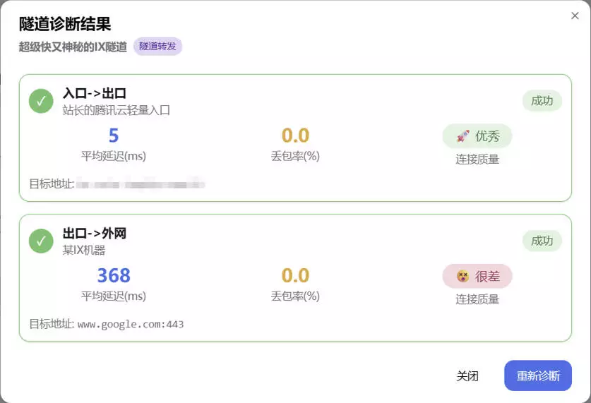 - 诊断说明:初次诊断时,你可能会发现从出口(IX机)到默认测试目标(Google)的延迟较高。这是正常的,因为IX的境外共享出口性能有限。当我们后续将流量转发到自己的独享落地机时,延迟会显著降低。